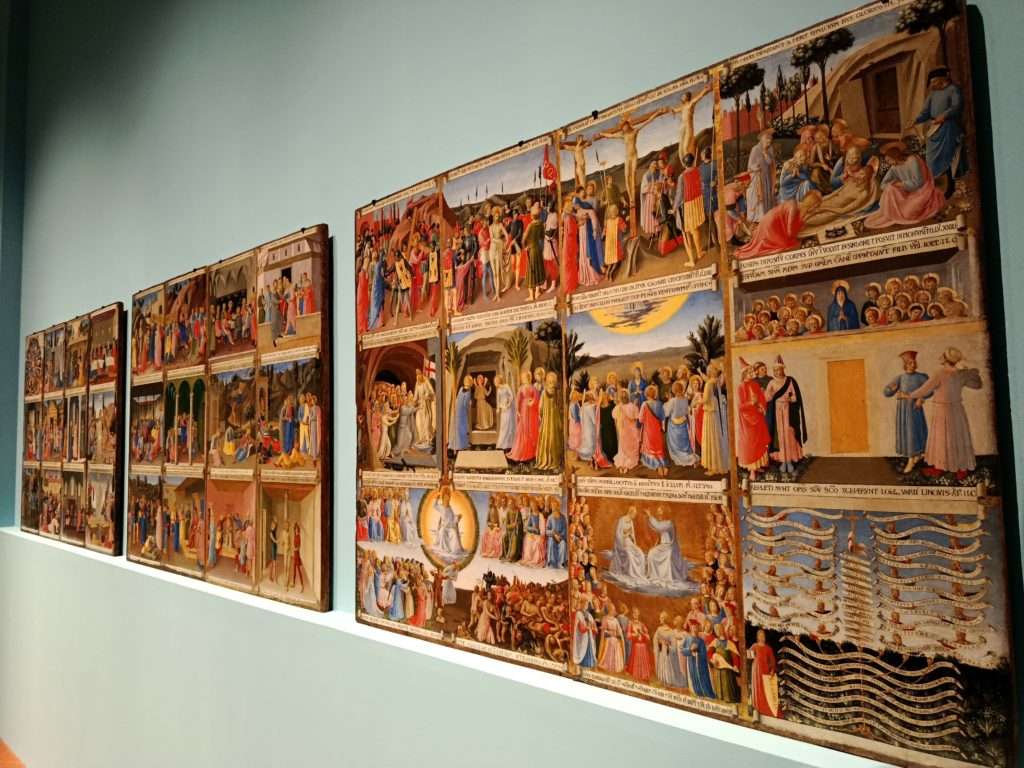 私が個人的に印象に残ったのは、サンマルコの祭壇画です。というのも、10年近く前にイタリア取材コーディネイトと通訳をずっとさせていただいている日経新聞社・文化部さんの取材で、イタリア有数のフィレンツェの修復センターを訪問した際にこの作品がgちょうど修復中だったのです。女性の修復士さんが特殊メガネをつけて細かい作業を行っており、正確な数字は忘れましたが1㎝四方の作業を行うのに何日も行うようなことを言われてたのがとても印象に残っています。