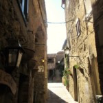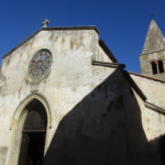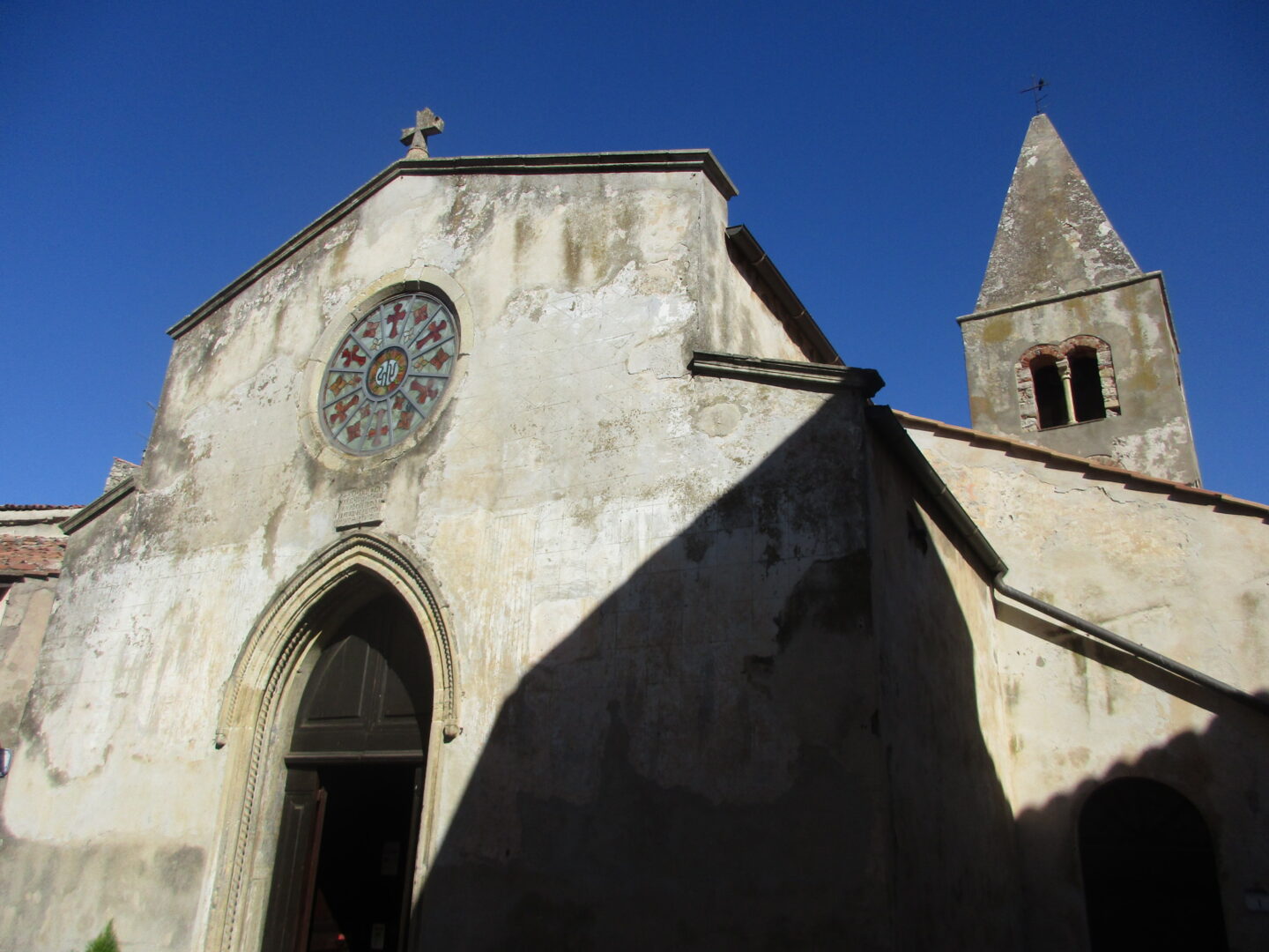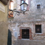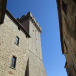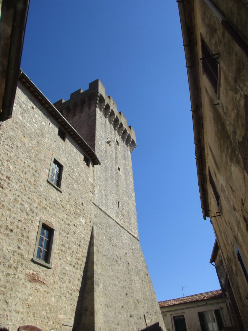 旧市街の外からも、そして旧市街のどこにいても必ず見えるのは、アルドブランデスキの要塞です。アルドブランデスキとはマレンマ~アミアータ山の地域を中世に治めた貴族 。ピティリアーノ、ソヴァーナ、サンタ・フィオーラ、スヴェレートなどの領主で、それらの町にも、彼この一族の名前のついた要塞や建物が残っています。その前にあるのはサン・ニコーラ教会、小さな教会ですが、14世紀のフレスコ画が見事です。
