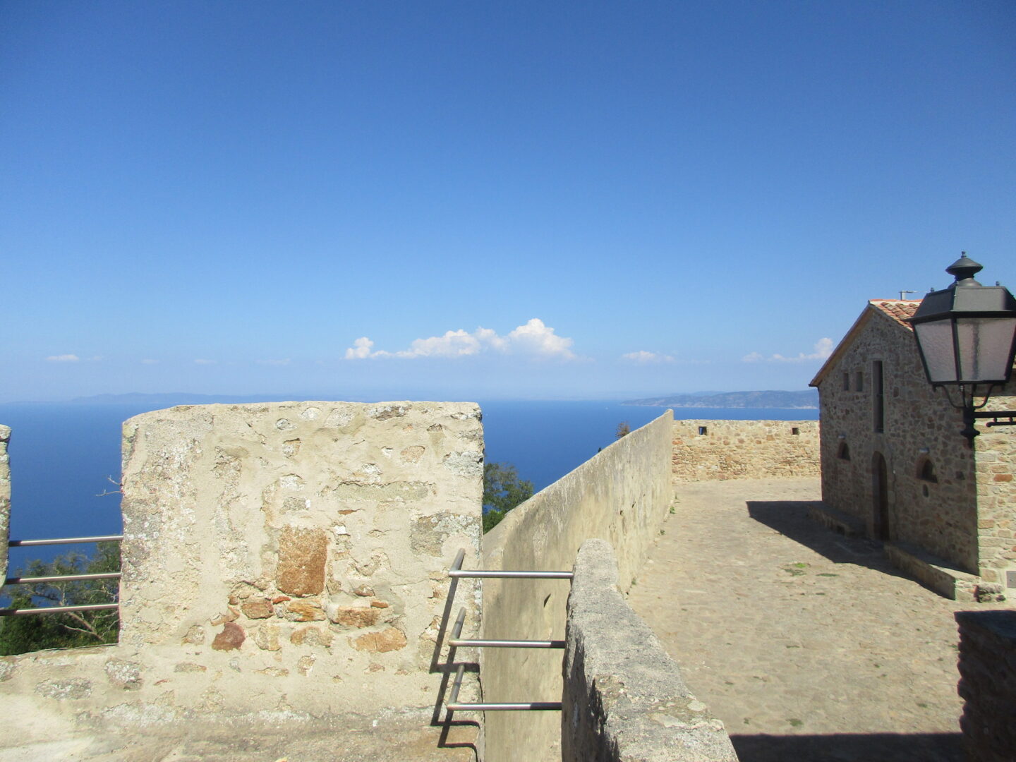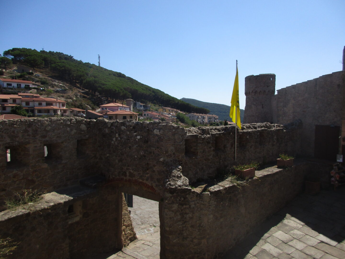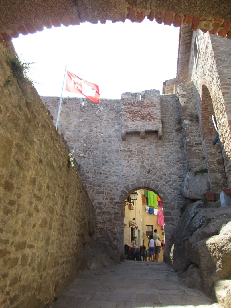 村の高みに来ると道の幅はやや広がり、中心にある要塞に到着します。要塞の建築開始は10世紀ですが、12世紀にはアルドブランデスキ家の所有に。その後島はピサの支配下に置かれますが、門にメディチの紋章画家が掲げられているように1400年初めにはメディチ家の支配下となり、トスカーナ公国の一部となります。残念ながら、要塞の中には入れませんでした(あとで調べても、どうやら一般公開はされてないようです)が、中はこんな感じ。