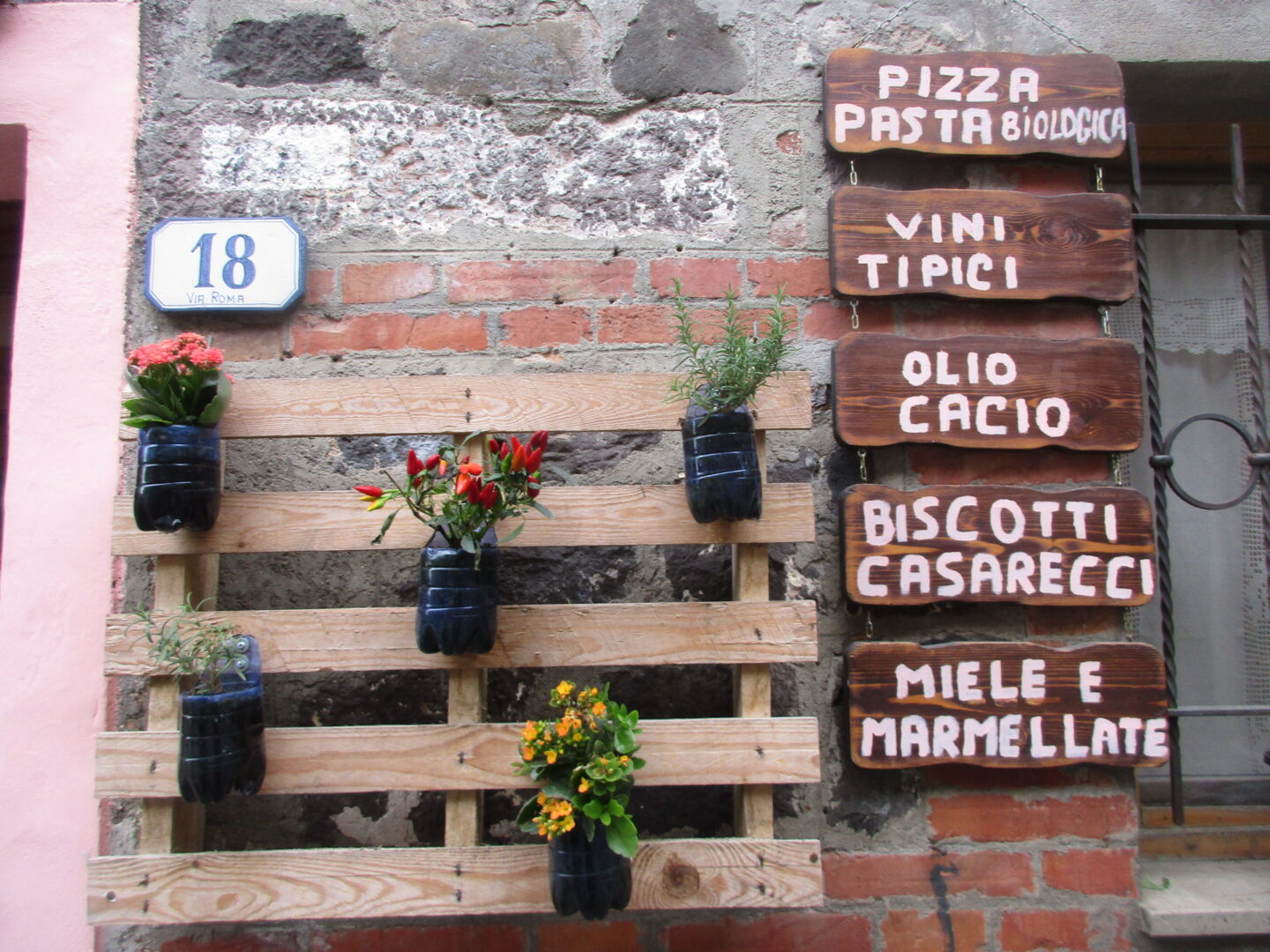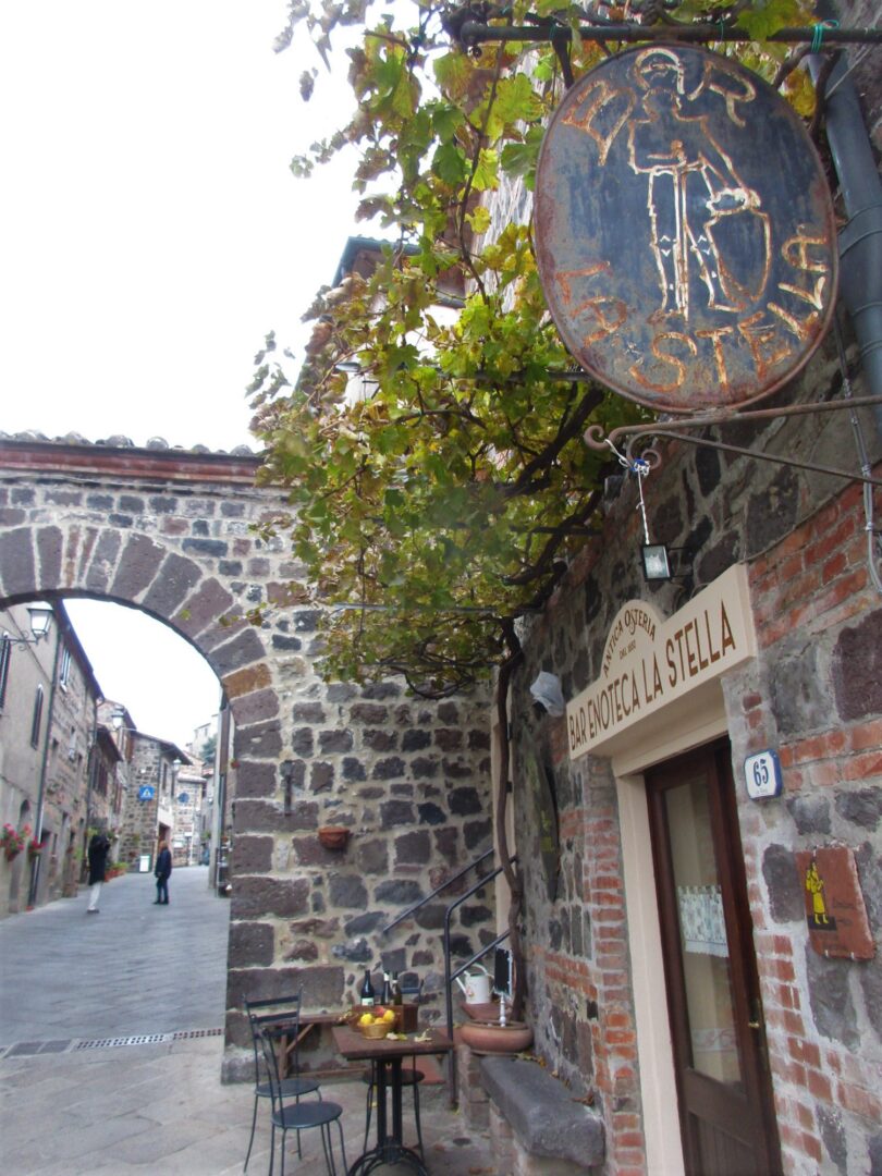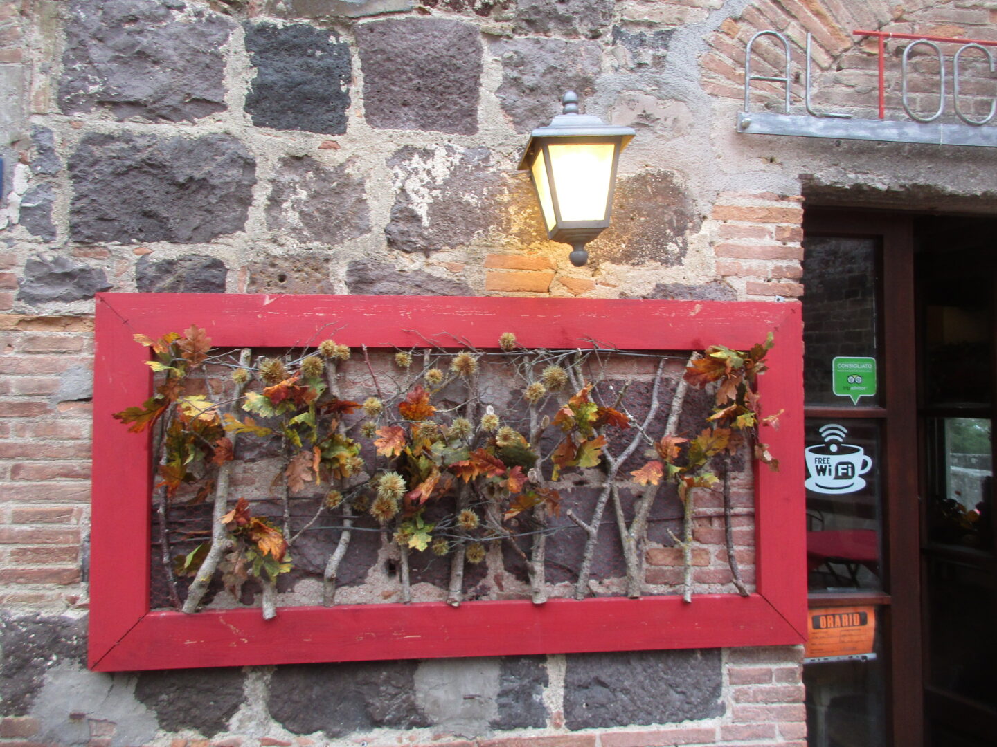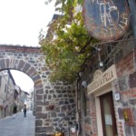 広場からは別の路地行って、またレナート・マージ通りに戻り更に下へ。ここも一般住宅や個人商店が並ぶ道で、帰りを考えるとあまり下りたくないかもしれませんが・・・最後まで降りると、趣のある村の門にたどり着きます。この門の外はバスの停留所。本数が少ないのでバスで来る人は少ないと思いますが、バスで来たらここが玄関口、行きは上りで帰りが下ることなりますね。