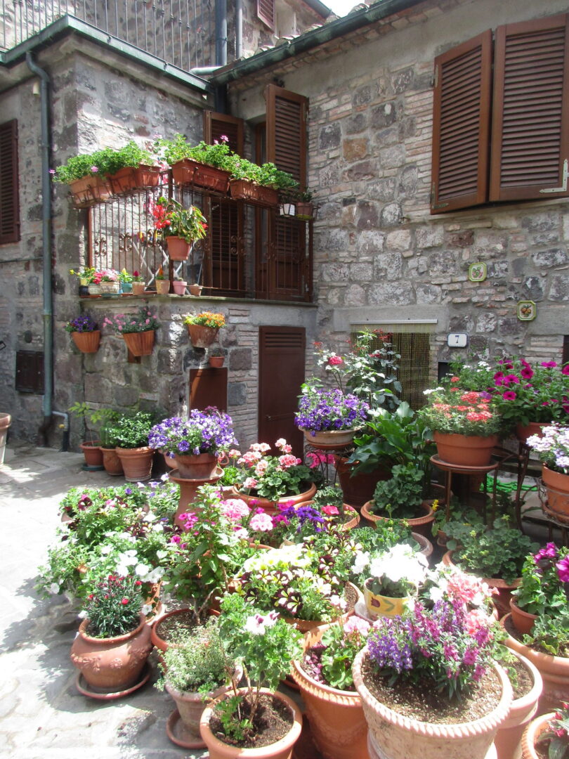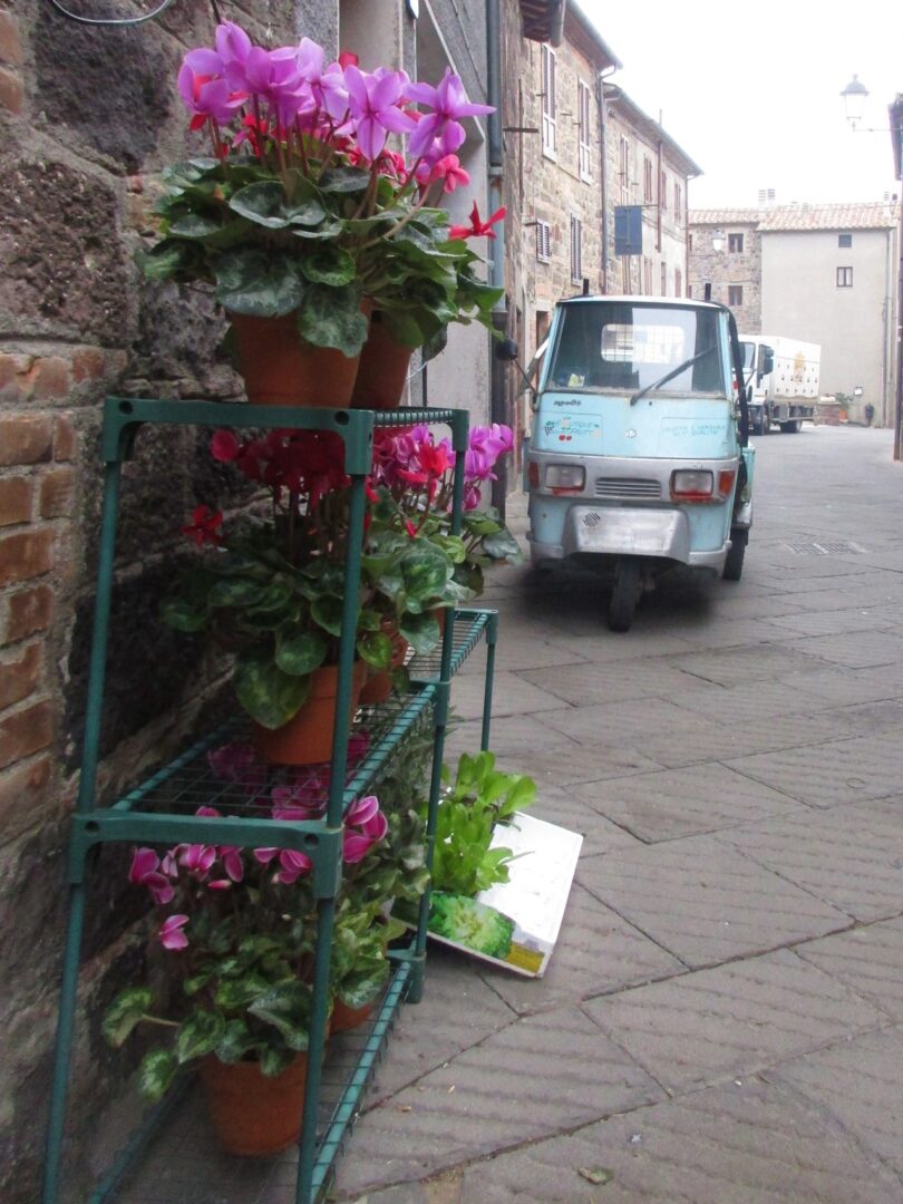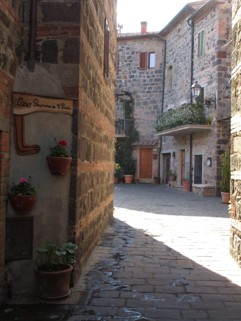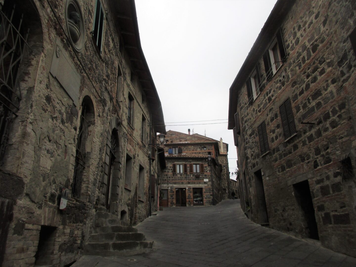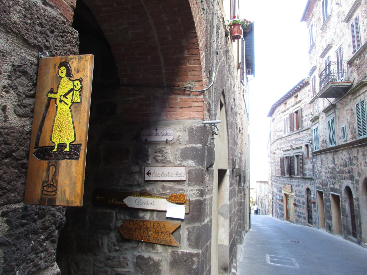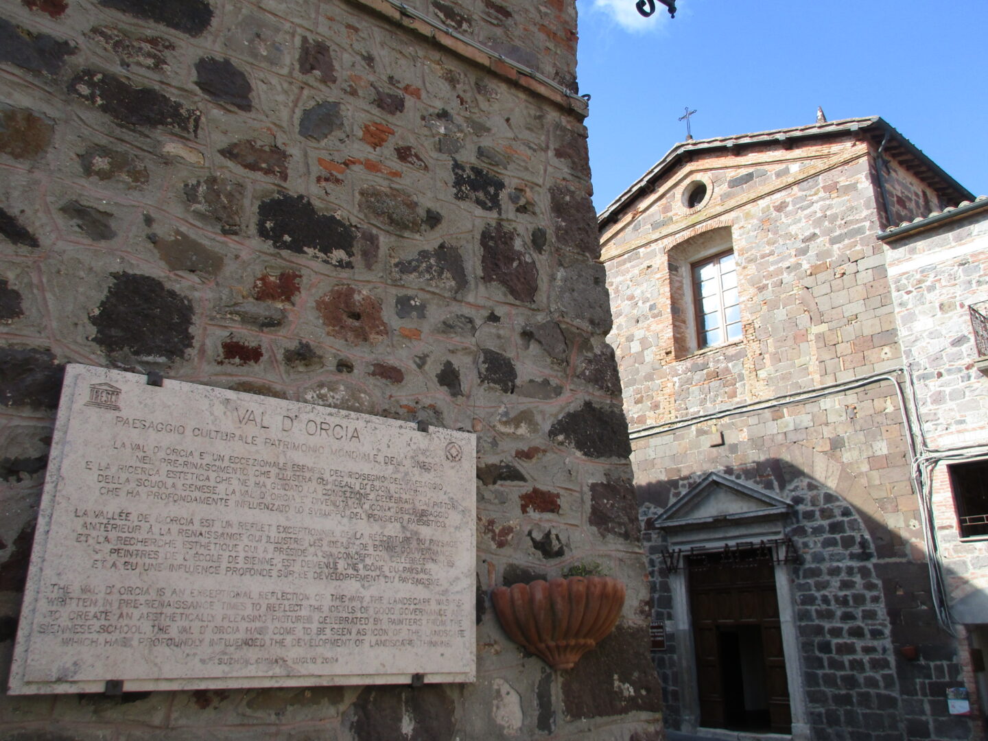 まずは村の中心であるサン・ピエトロ広場から。ここの一方は城壁に沿うように公園になっており、ここからアミアータ山やオルチャ渓谷のパノラマが楽しめます。そしてパノラマを背に左側がサン・ピエトロ・アポストリ教会。10~11世紀頃に建設が開始されましたが、すぐに拡大・改築が行われ、記録では1224年に完成。現在ではロマネスク・ゴシック様式の3身廊の教会となっています。入って右側には、フィレンツェの捨て子養育院などでも作品を残す、アンドレア・デッラ・ロッビアの聖母子像が、祭壇にも彩色テラコッタの十字架像があります。
