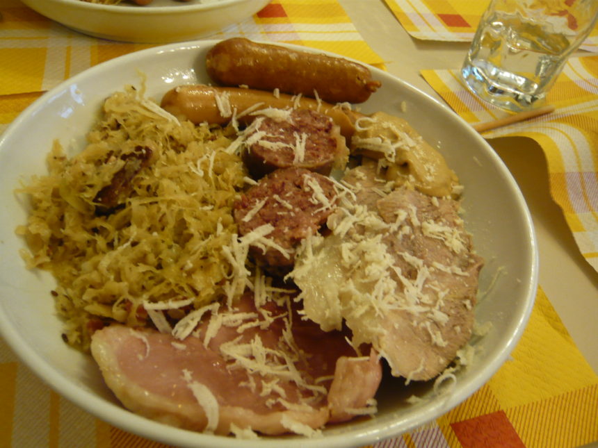 よく出てくる付け合わせのもう1つが、このザワークラウト。これもドイツ語圏で出てくる料理ですが、国境を接しているイタリアの地方でもおなじみの料理です。私は結構好きなので、今回記事をリライトした記念に家でも一度作ってみたいと思います。ちなみに写真はトリエステ郷土料理店で食べたものですが、メインも茹で肉とソーセージで、もう雰囲気がイタリアっぽくありませんね。