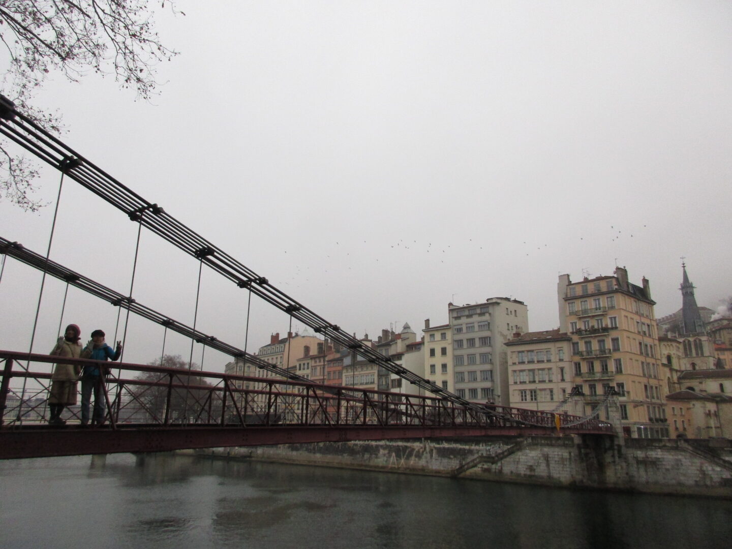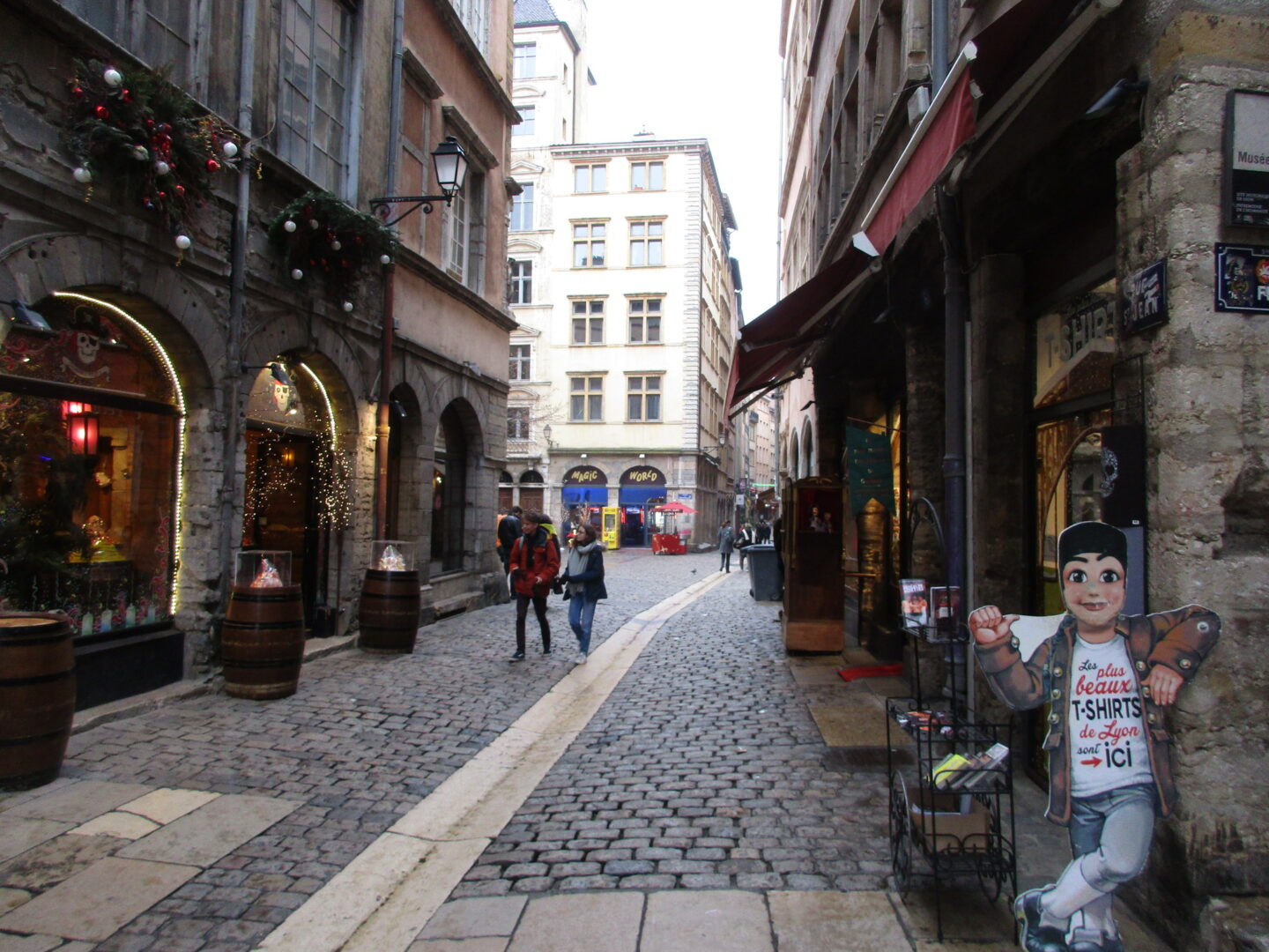 私も混じってみました(笑)。この坂を下ると、そのままクロワ・ルースへ、そこからリヨンの町並みが見えるビューポイントを寄りながら、もう1つ有名なだまし絵へ。その途中の界隈は、アート系のお店や雑貨屋さんが点在し、ウィンドゥを眺めながら行くだけでも楽しいです。そこから川沿いへ出て・・・