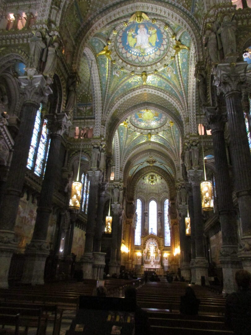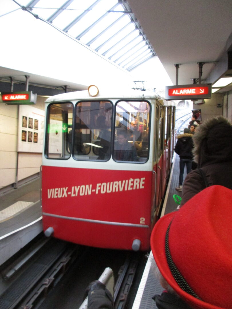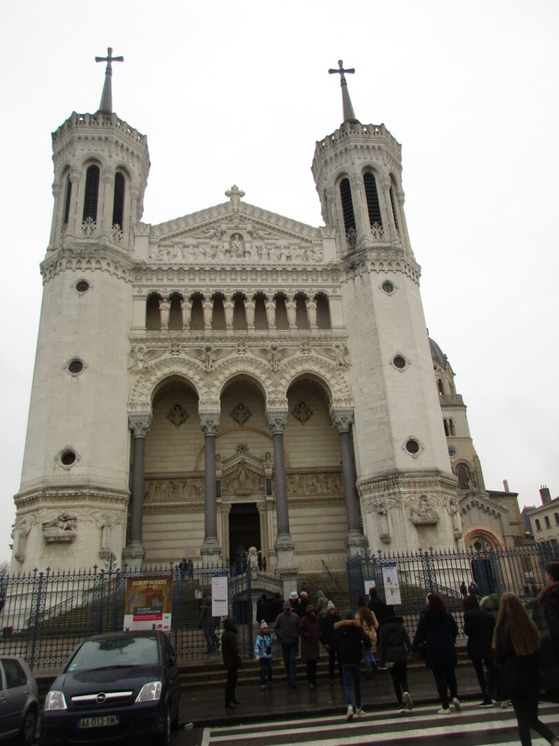 旧市街の一番の見所・ノートルダム寺院は丘の上にあるので、旧市街駅「Vieux Lyon」駅からケーブルカーに乗りましょう。寺院のあるフェルヴェールの丘までは、たった1駅。チケットは地下鉄・トラムと共通です。着いて登ったら、すぐにノートルダム大聖堂がドドン!とお出迎え。ゴシック建築らしく、ステンドグラスが大きくて精巧で美しい!地下礼拝堂も立派です。