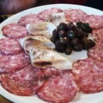 さて、注文ですが、こういうところは ちゃんとしたメニューはありません。外に貼ってるメニューか、カウンターに貼ってるメニューを見て・・・イタリア語のみ、さらに在住者でも時に手を焼く手書き!あるいは、テーブルで口頭で。カメリエーレが英語OKかは不明でしたが、 隣の人の指差してこれ~とかもアリ です。残念だったのは、 トスカーナ料理では必須のレバーパテのクロスティーニがなかった こと。これは何故なのか不明・・・ともあれ、まずは前菜もってことで、 トスカーナのハム・サラミ盛り合わせ 。多そうだったので、2人分で頼んだのに・・・どやっ!って量。