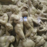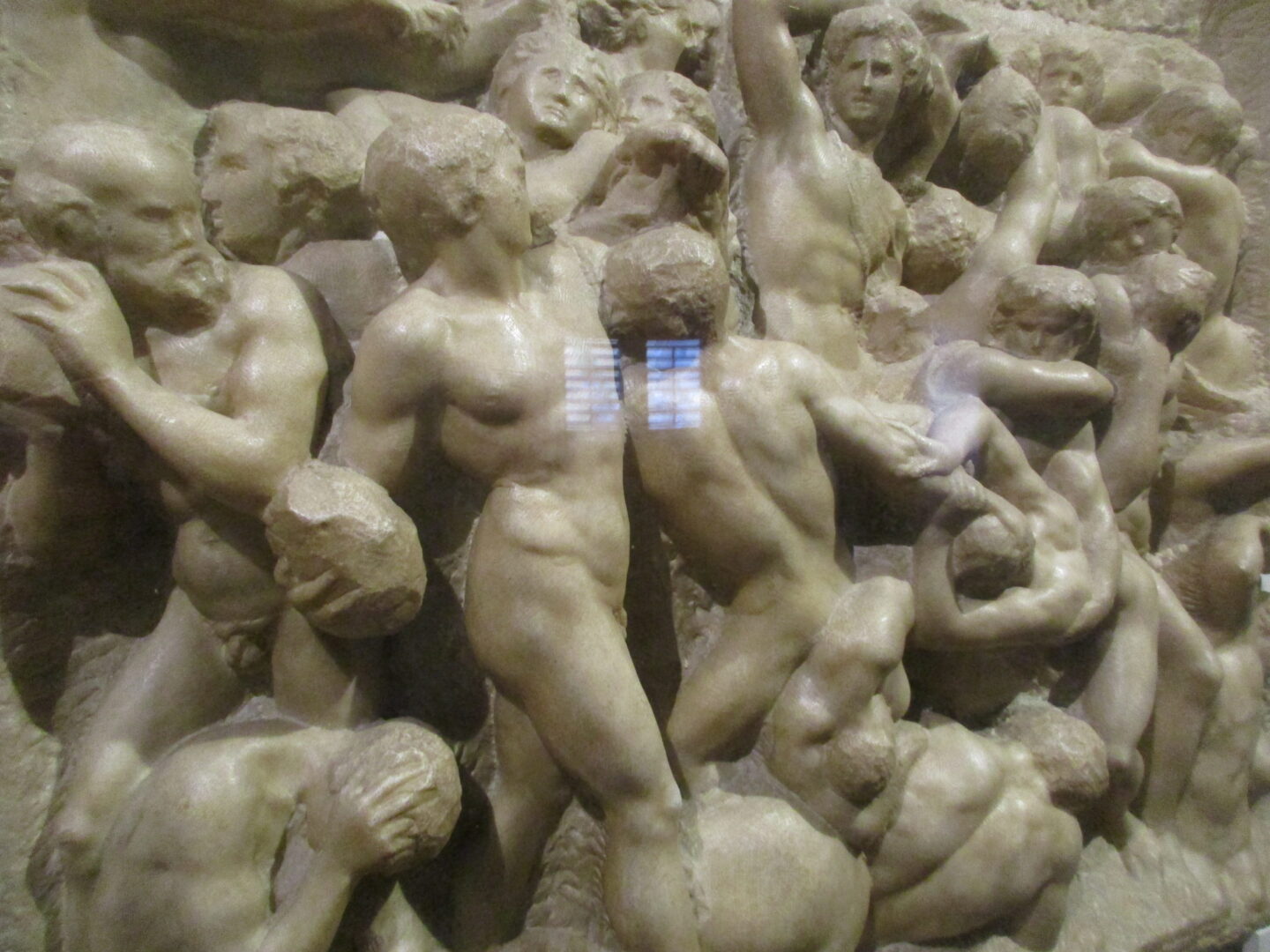 「階段の聖母」の後、同じく芸術アカデミーで製作されたもう1つの作品が、この「ケンタウロスの戦い」。こちらはロレンツォ・イル・マニーフィコに捧げられた作品とされていますが、1492年の彼の死とそれによる政況変更により、作業は止まったそう。いくつもの体と頭が絡み合う迫力あるこの作品は、未完成ながらも、ミケランジェロ少年期の最高傑作とされています。透明感と柔らかさを感じる「階段の聖母」と比べ、躍動感のあるこの作品、私もすっかり魅せられて食い入るように見入ってしまいました。