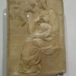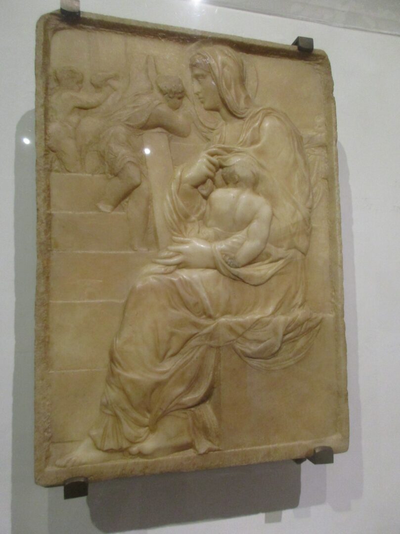 ミュージアムの宝は2つの彫刻。13才の時に彫刻家ドメニコ・ギルランダイオの工房に入るや否や、その才能を余る所なく発揮したミケランジェロ。その2年後には当時のメディチ家の当主であるロレンツォ・イル・マニーフィコの芸術アカデミーに派遣され、その時に製作したレリーフ作品が、「階段の聖母」(写真はギャラリーにて)。小さな作品ながら、すでに壮大なドラマが感じられる作品として評価されています。この作品は、ミケランジェロの甥っ子であるレオナルドからトスカーナ公のコジモ1世に贈られましたが、1616年に「偉大な祖先への賞賛」として、トスカーナ大公コジモ2世からレオナルドの息子であるミケランジェロ・イル・ジョヴァネに返却され、それから現在までの400年間、このブォナッローティの家に保管・展示されています。