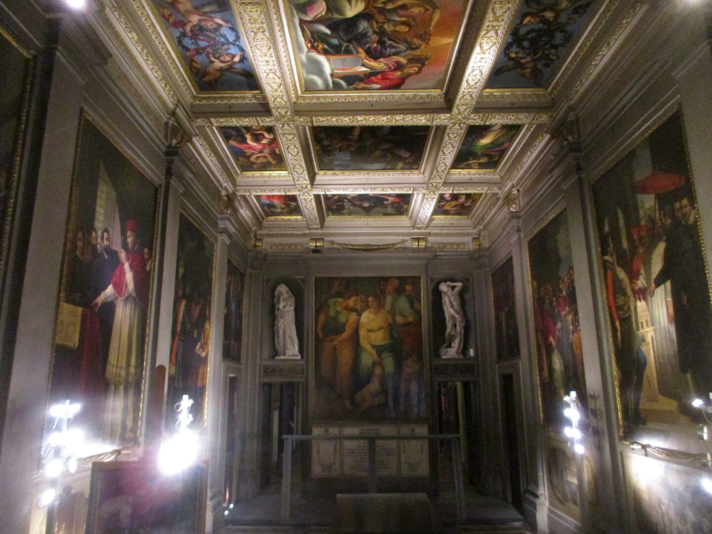 その他の見所は、ミケランジェロの甥っ子の息子、ミケランジェロ・イル・ジョヴァネの計画で装飾を施した4部屋。最初の「ギャラリー」は、ミケランジェロへの賛辞として壁面に彼と法王・権力者との面会のシーンが10枚描かれ、窓側の壁面中央にはミケランジェロの肖像が飾られています。