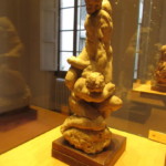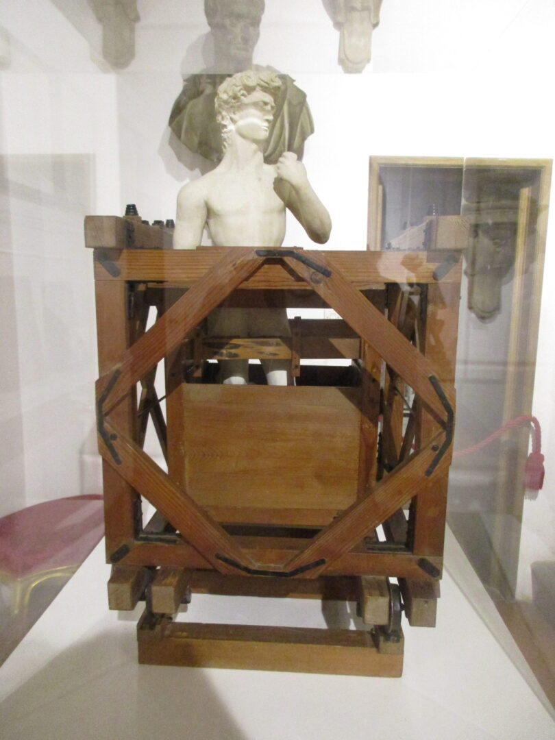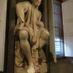 同じく2階の「サン・ロレンツォの製作所」では、メディチの菩提教会であるサン・ロレンツォ教会のためにミケランジェロが計画したものが残っています。1つ目はファサートの木製モデル。現在は未完成で残っているサン・ロレンツォ教会のファサートですが、メィチ家出身の教皇・レオ10世の時代にミケランジェロに計画が託されていたのです。最終的には1520年に契約書は撤回され、その2代後のメディチ家出身の教皇・クレメンテ7世によって工事は再開計画がなされるも、彼の死によって工事が再び行われることはありませんでした。もう1つは、ミケランジェロのサインが残る唯一の大型粗型「川の神」。彼の代表的作品である新聖具室のウルビーノ公のロレンツォ・ディ・メディチとヌムール公のジュリアーノ・ディ・メディチの霊廟の下に、この「川の神」が2体づつ合計4体置かれる予定でした。結局、政況の変化などでミケランジェロがローマに去ったために実現できなかったそうです。
