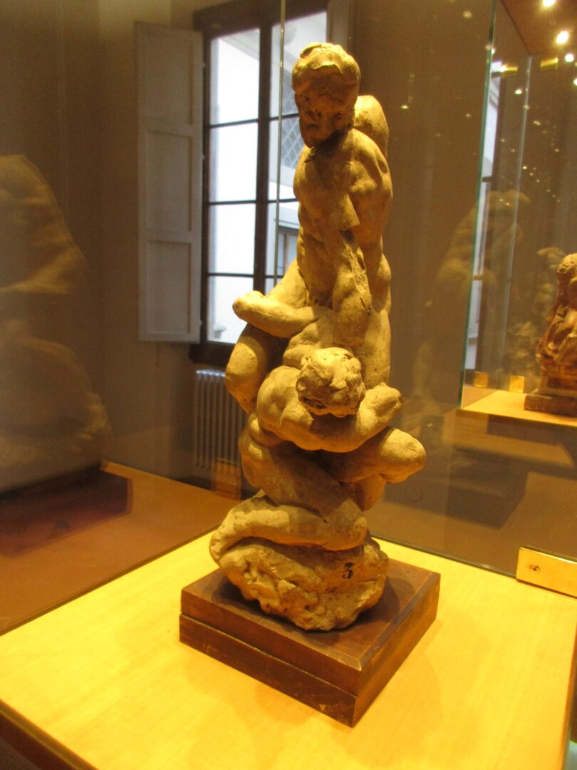 レリーフの部屋からホールを挟んで向かい側にあるのが、彫刻の粗型の部屋。1664年以前の記述が残っておらず、一時期不明となっていた粗型は19世紀半ばに再発見され、ミケランジェロのものと確定されたもの、不確定なものを含めて、この部屋に展示されています。粗型は、ミケランジェロが若い頃から老いた頃まで年代は幅広く、また蝋、木、テラコッタなど、その素材や技法もさまざま。その中で最も秀逸な粗型が、1530年ごろ製作の「2人の闘士」(上写真中央、アップ写真はギャラリーにて)。最終的に別の彫刻家により製作されたヴェッキオ宮殿前の「エルコレとカークス」や、ヴェッキオ宮殿の500人の間内にある「勝利の守護神」など、どの作品の粗型であるかは確定されていませんが、身体の緻密さや躍動感などミケランジェロ作品の特徴が、この小さな粗型からも十分に感じられます。