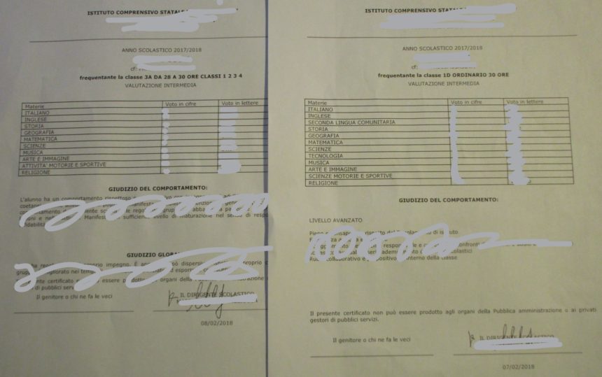 イタリアの学校は、9月の半ば始まり&6月10日前後終わり。ちょうど2月の中頃が、1年の半分ってことで前期の成績表が渡されます。明確に学期末と言うのがないので、子供たちの連絡帳に記入か、プリントで成績表が渡される日の連絡が来るんですが、これ、子供が受け取るのでなく、親が受け取りに行くのも日本と違うところ。渡すのも親1人1人が教室に入り、先生からのコメントもあるので時間もかかる(苦笑)。先生によって違うのですが、長男の先生は小学校も中学校も時間帯だけ指定で、あとは来た人順、次男の小学校の先生は懇談も成績表も1人1人時間指定で連絡が周ってきます。
