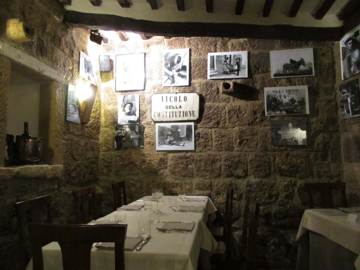 お店は旧市街を入って南側のメインストリート・ズッカレッリ通りをまっすぐ行き、左側。この通りに面して入口はないので、手前に看板と矢印が出ています。ミシュランやガンベロ・ロッソなど、数々のレストランガイドに掲載されている有名店だけあって、店内は満席!入ってすぐのホールは4テーブルほど、その先に同程度のスペースと更に下にも同程度のスペースがあるので、全部で50席ほどでしょうか。ともあれ、予約がベターです。