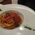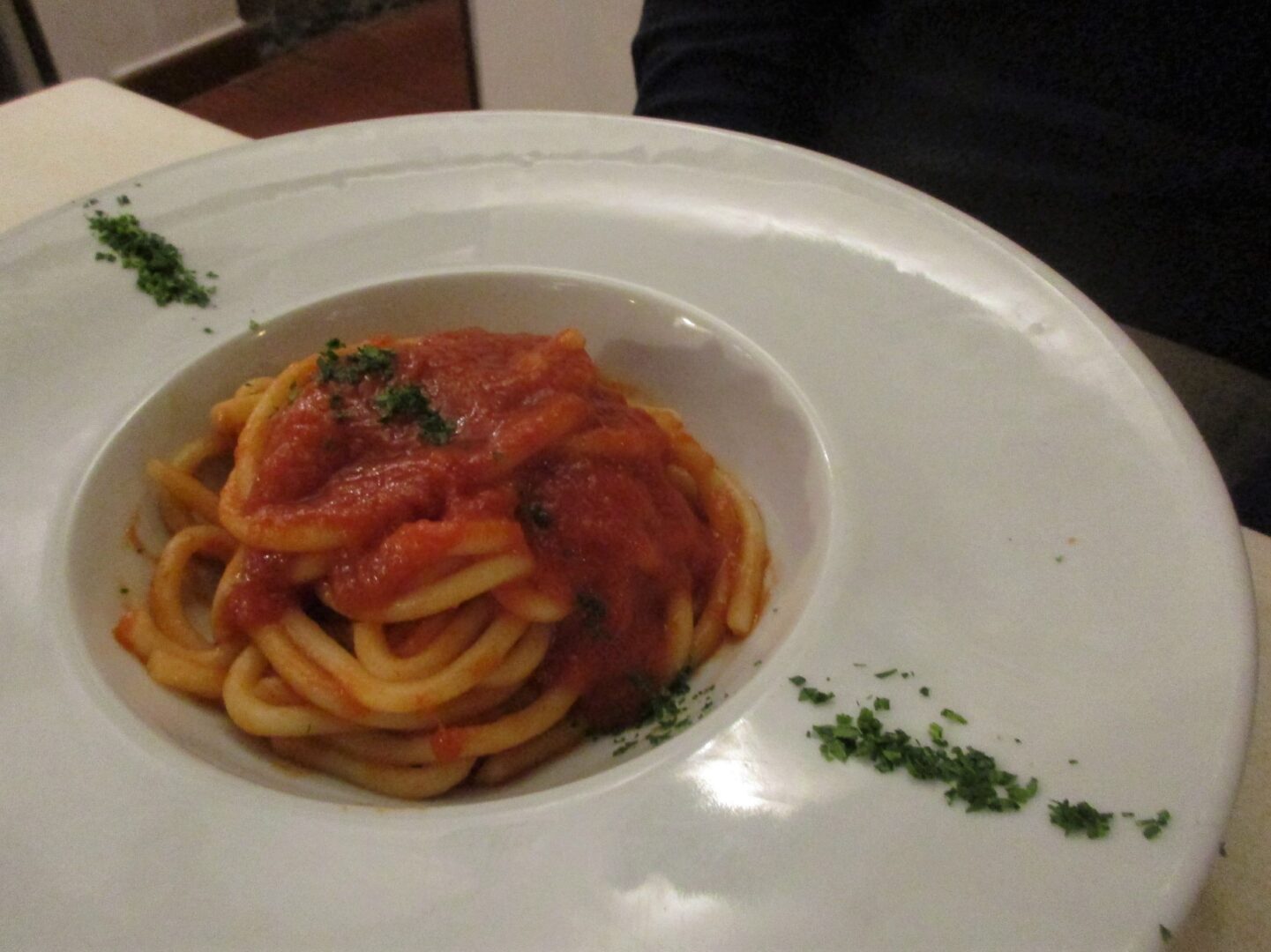 そしてプリモは、リコッタとほうれん草のスープ。以前ソヴァーナのレストランでも食べましたが、これが羊のお乳のリコッタチーズだったとは当時は知りませんでした!まだ少し肌寒かったので、身にしみいるような美味しさ。単品で頼んだもう1つのプリモは、シエナ県を中心にトスカーナ南部で食べられる郷土パスタのピチ。ニンニクが効いたトマトソースはシエナ県でが「アリオーネ」と呼びますが、マレンマでは「アリアータ」。車で1時間程度しか離れていないのに、ここでも地方の差が出てくるのが面白いですね。