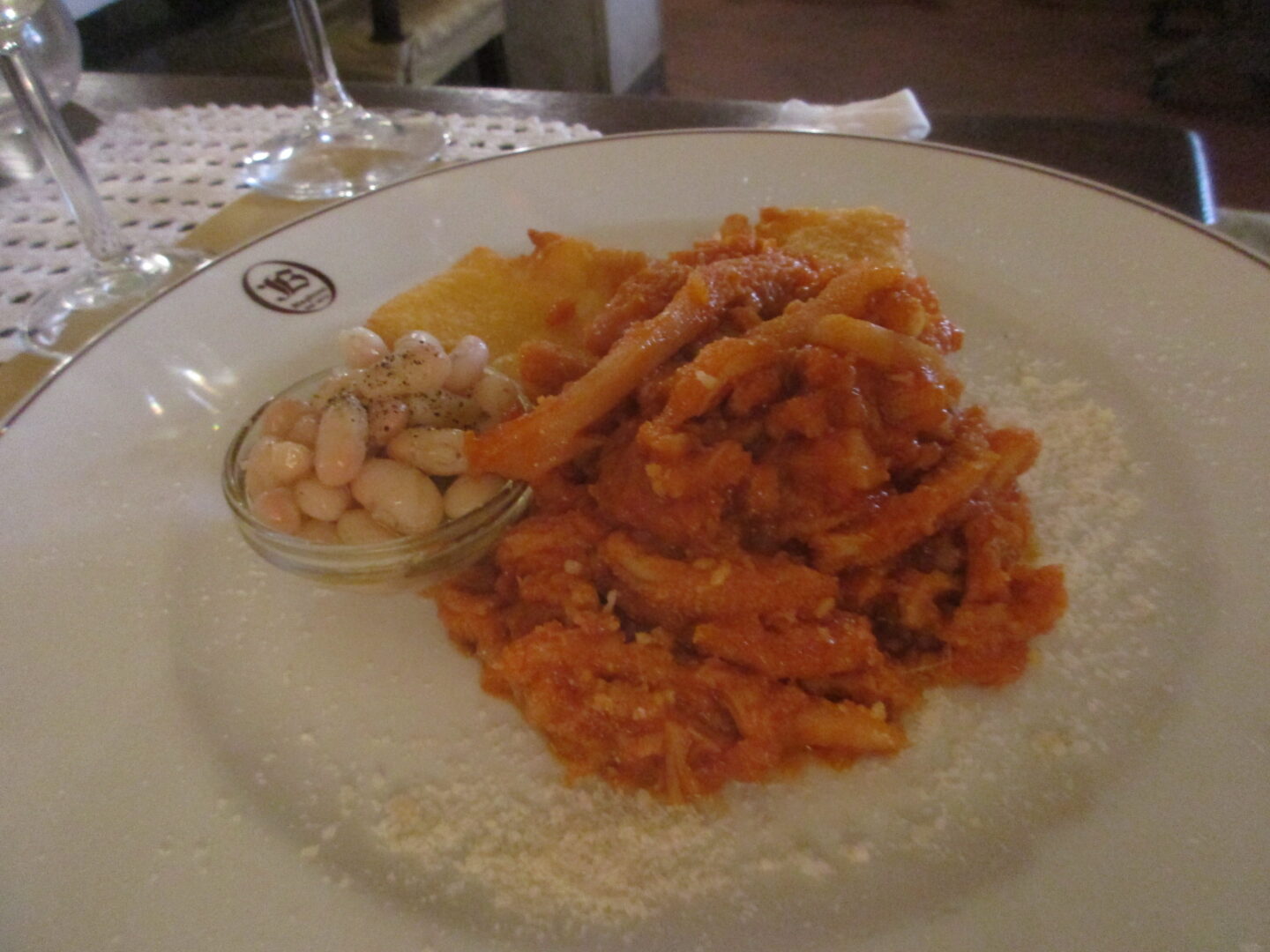 私が選んだのは、「ファリナータ」というトウモロコシ粉を溶かしたスープ。ピストイアやルッカの山間部を中心としたトスカーナ料理で、昔の農民の「貧しい料理」の1つ。典型的な具は黒キャベツと豆ですが、要は余ったものを使ったコストゼロの料理です。トウモロコシ粉というとポレンタが有名ですが、これはポレンタよりもシャバシャバしていて、ポタージュっぽい感じ。とてもやさしくてほっとする味です。