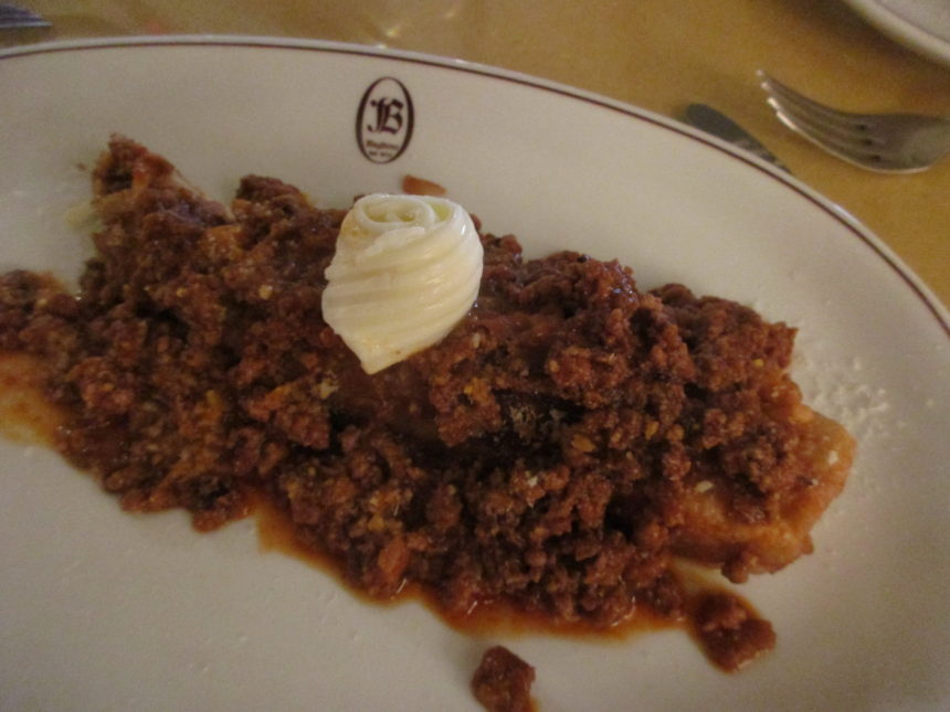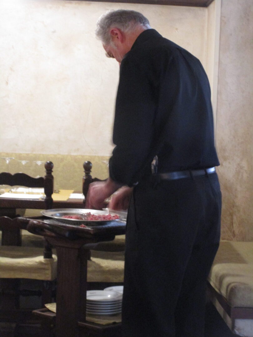 生肉のタルタル(タルタル好きなので超注目してしまいました)!ワゴンで運ばれてきて、テーブルの横で給士係のおじさんが味付けして取り分けてくれるんです。その手つきにほれぼれ、そのタルタルにもヨダレ・・・いや、ほれぼれ。今回はセロリに注目しすぎてこのメニューに気が付きませんでしたが、次回はこれをリベンジしたいと思います。