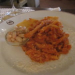 プラート風セロリです。セロリがほとんど見えてませんが(笑)セロリ1本に衣をつけて揚げて、その上にミートソースがたっぷりかかっています。上に添えられているのはバター。これでハーフポーションなのですが、フルポーションだとセロリ2本にこのミートソースの量・・・これが大好きでこれだけ食べる方には良いですが、他にもお料理を頼まれる方は、同行の方とシェアされるのをおススメします。主役はセロリなのですが、がっつりとメインで通用する一品、これは家でも真似したいと思います。
