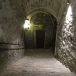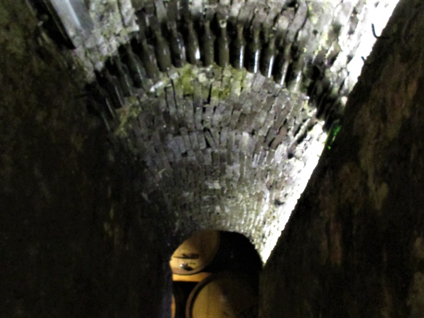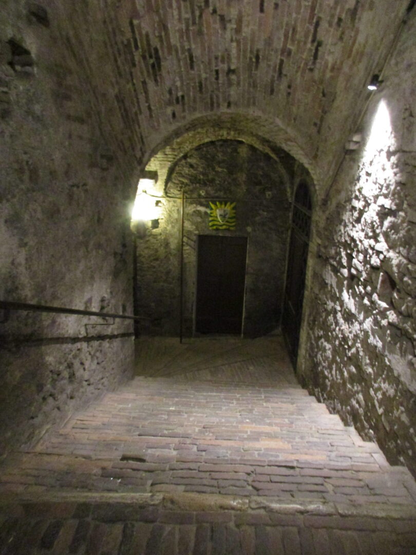 薄暗い中を下っている中で見えるのは、紋章。こういう2つの紋章が組み合わさったものは、婚姻した両家の紋章です。リッチ家は左側なのですが・・・何か分かりますか?リッチ=お金持ち、貴族だけに英語のイメージがあるかもしれませんが、イタリア語でリッチ=ハリネズミ!写真が不鮮明で分かりにくいですが、おてんと様にぐっと顔を向けたハリネズミなんですが、これには伝説が:12世紀頃、モンテプルチャーノは天気予報を魔女に予言させていました。それを覆したのが、ハリネズミの行動から天気予測を提唱したある男性。彼は「リッチョ」と呼ばれるようになり、リッチ家の紋章もその伝説にあやかったとされています。
