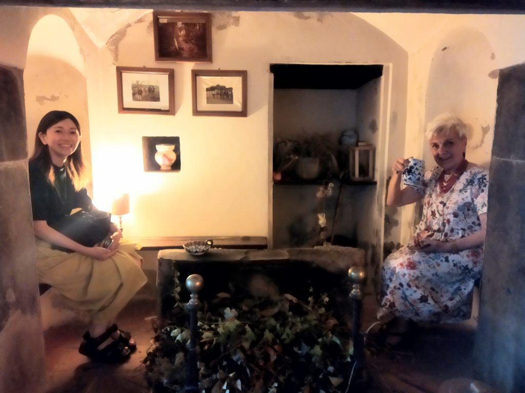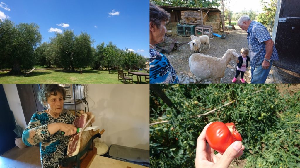 アグリツーリズモのかわいい赤い一軒家を見た瞬間、思わずうわぁと声が出ました。洗面室には手製の精油と手づくりせっけんのよい香り。テラスのブランコも楽しく、朝も昼も夜も鳥のさえずりのなかでブランコに揺られて山々や星空を眺め、至福の時を過ごしました。朝ごはんはアンナお手製の大きなパンと桃ジャム、畑で一緒に採ったそら豆とアーティチョーク。飼っている元気な鶏の卵はゆで卵に。味が濃くておいしかった。畑見学でパーマカルチャーについて説明してくださったアンナは、お話を聞いているだけで幸せな気持ちになるような、とても素敵な方でした。