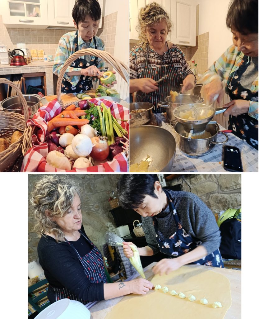 料理教室の初日に家に到着すると、台所にダニエーラのバッボ(お父さん)の畑から届いた、つやつやと輝く見事なな野菜。丸いズッキーニは初めて見ました。ブロードづくりでは目的によって違う肉を入れるタイミングや途中でトマトピューレ(もちろん自家製)を少し加えること、ソッフリットづくりではオイルの量(たっぷり!)やそれぞれの材料を加えるタイミングもしっかり見せてくださいました。今までテレビでしか見たことのなかった、まな板を使わずに空中で野菜を切る技も! ドルチェにはご主人のフランチェスコお手製のヤギのリコッタと自家製の桃ジャムも! リゾットもズッキーニの肉詰めもドルチェも、どれもしみじみとおいしく、身体に染み入るような味でした。二日目のパスタの生地づくりでは、詰め物によって粉と卵の配分を加減すると教えてもらいました。卵も自家製。ソッフリット用に刻んだ余った野菜で作った肉が入っていない「うそっこミートソース」は、 ミートソースを食べているような気になります。爽やかでおいしいし、肉を食べない人と食事するときにも使えそう。昨日つくったマッシュポテトを絞りだし、生地を重ねてルーラーで切って、トルテッリがたくさんできました。ヤギ見学ではおばあちゃまと猫にも挨拶。フランチェスコの帰りを待つ間、パンとオリーブオイル、ワインで”農夫の食事”。その後にジャガイモのトルテッリのミートソースとうそっこミートソース、バターとセージの三種和えと、甘酸っぱさが美味しい豚ロース肉のプルーン詰め。すべてが、文句なくおいしい。フランチェスコのヤギのチーズ二種も絶品でした。ご夫婦と娘のガイア、中山さんとなごやかに、6月末の農民の祭の話がとても楽しく、いつか夫と一緒にお祭りに来られたらなあと思いました。また、ご長男が夜勤に行かれるとか、お祭りの話し合いとか、ご家族のふだんの生活を垣間見られたのも嬉しかったです。私の茫漠とした希望に応えるためのメニュー、そして日本に帰ってからも応用できるようによく考えてくださり、ダニエーラには感謝でいっぱいです。